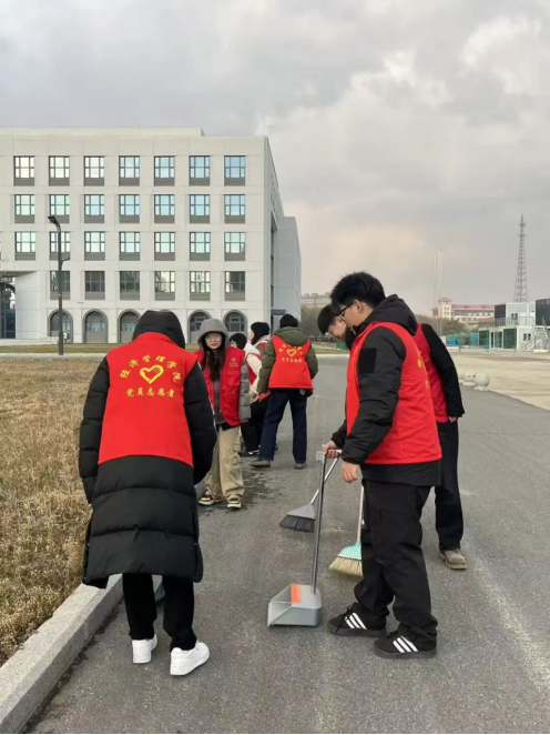 发展对象身着印有“党员志愿者”字样的红色马甲,开展校园环境清洁志愿活动。活动现场,学员们手持扫帚、簸箕等工具,认真清扫道路垃圾、捡拾绿化带杂物,以实际行动维护校园环境。