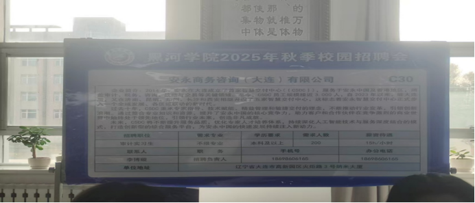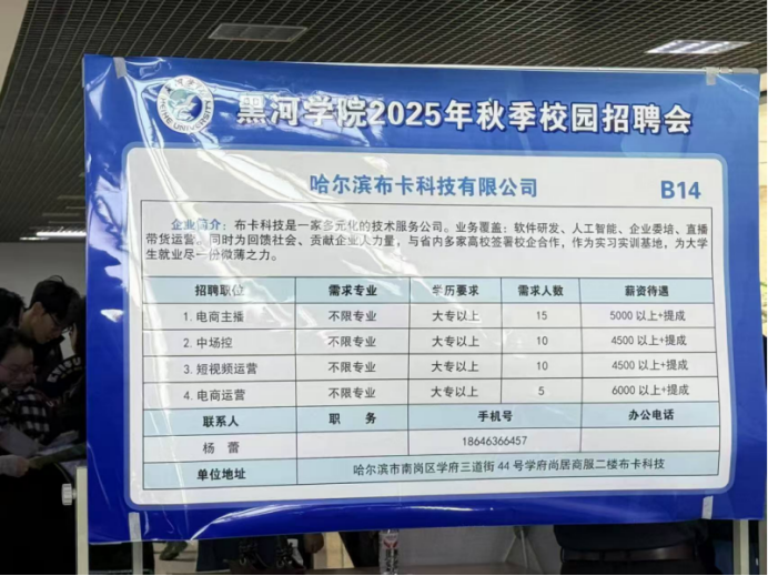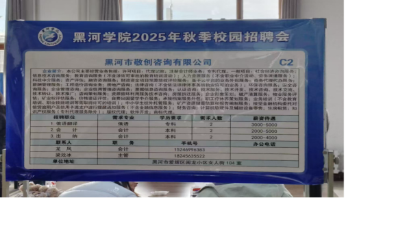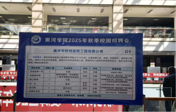 为助力广大学子搭建通往理想职业的坚实桥梁,推动校企合作迈向更深层次、更广领域,2025年10月18日,黑河学院秋季校园招聘会在图书馆隆重拉开序幕。经济管理学院以高度的责任担当与细致的服务精神,全程参与、鼎力支撑,为这场人才盛会的顺利举办提供了坚实保障。