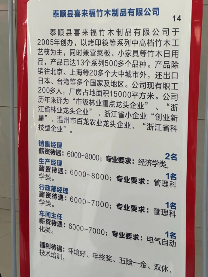 此次汇聚多家浙江优质企业,共115个就业岗位,计划招聘364人。岗位类型丰富多元,囊括市场营销类79个、教师类3个、技术类21个、财务管理类7个;专业需求覆盖面广泛,涉及国际经济与贸易、会计学、跨境电子商务等专业。本次招聘岗位工资福利待遇优厚,除“五险一金”外,企业还准备了年终奖、全勤奖、节日福利、年度体检等,为学子量身打造就业机遇。