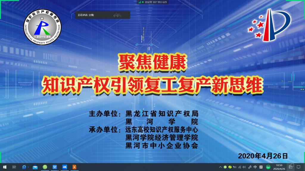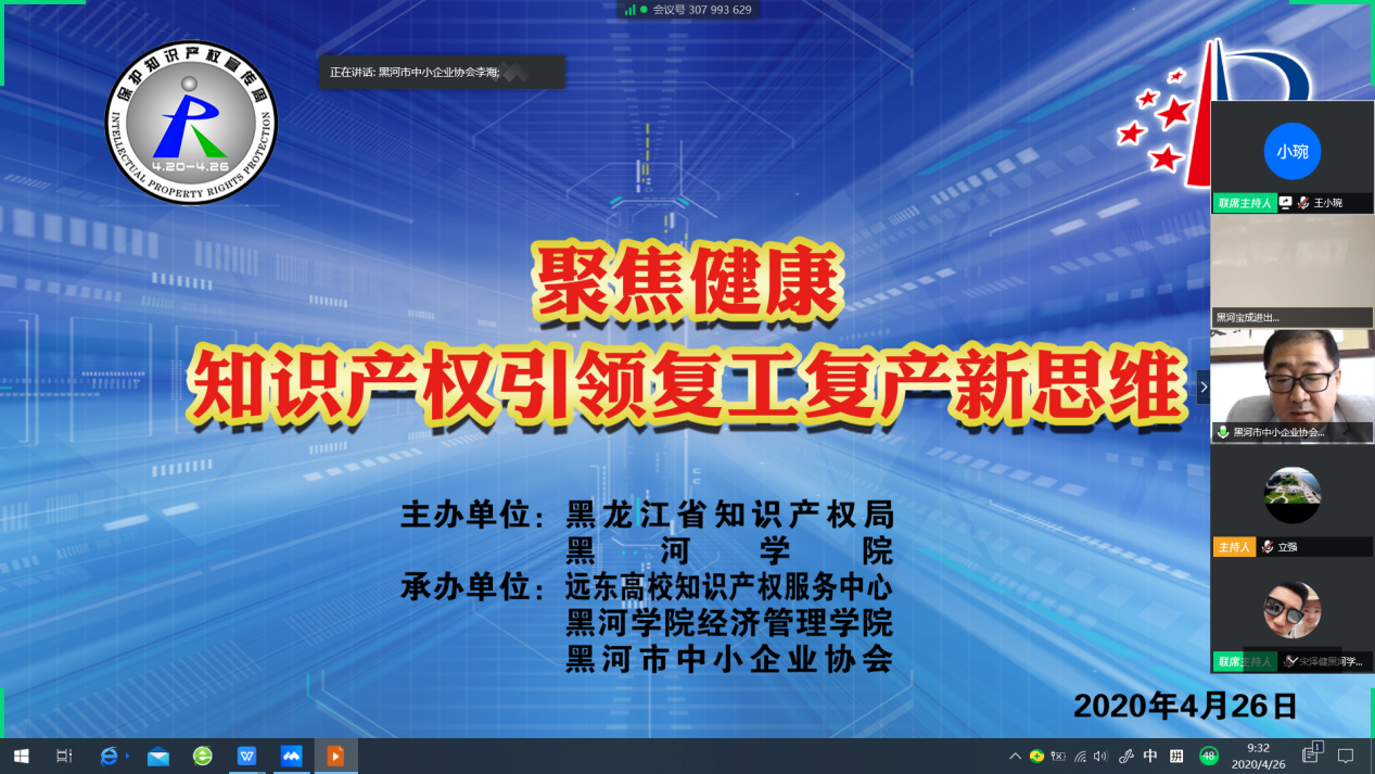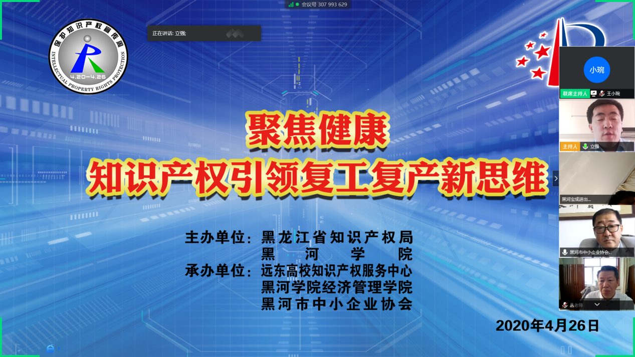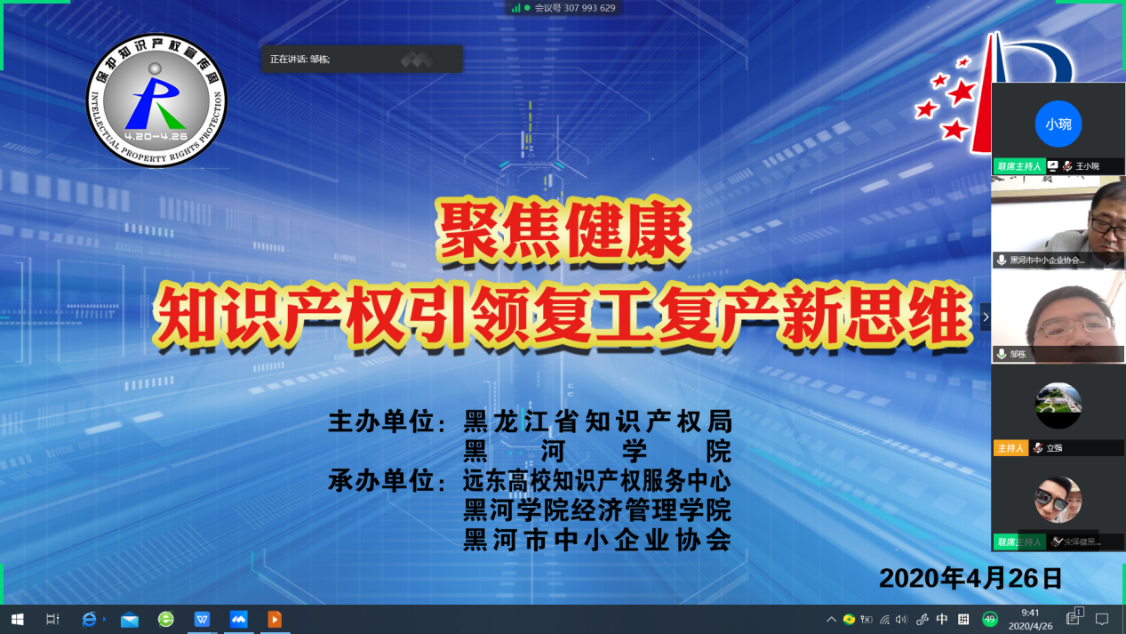 (撰稿人:王小琬)2020年4月26日,由黑龙江省知识产权局与黑河学院共同主办、远东高校知识产权服务中心、黑河学院经济管理学院和黑河市中小企业协会联合承办的“聚焦健康——知识产权引领复工复产新思维”线上会议如期举行。黑河学院副校长丛喜权教授及黑河市中小企业协会常务副会长兼秘书长李海共同出席了本次会议。
