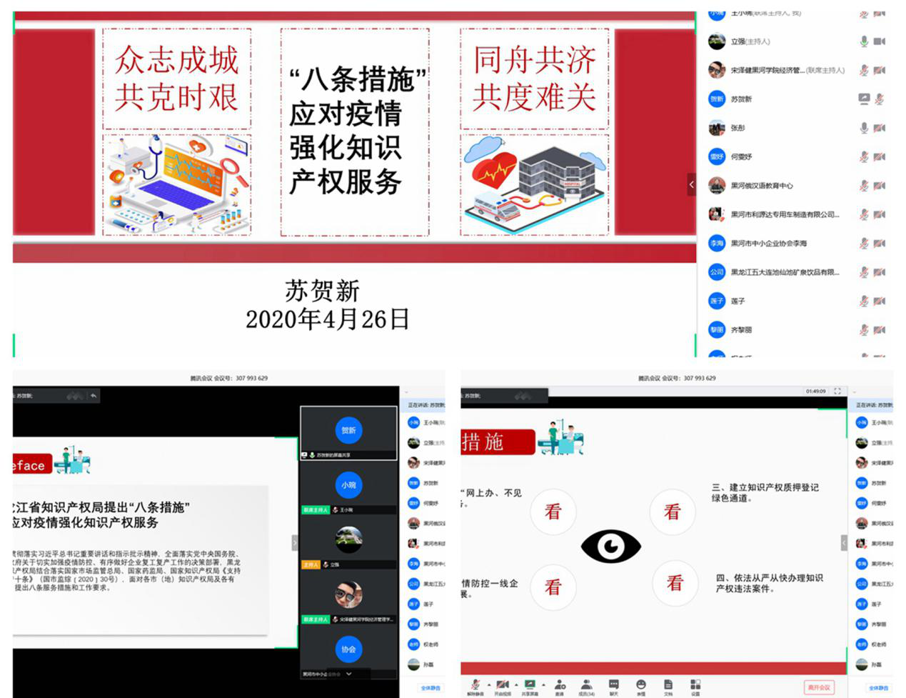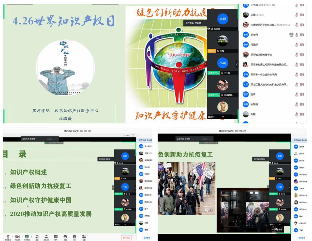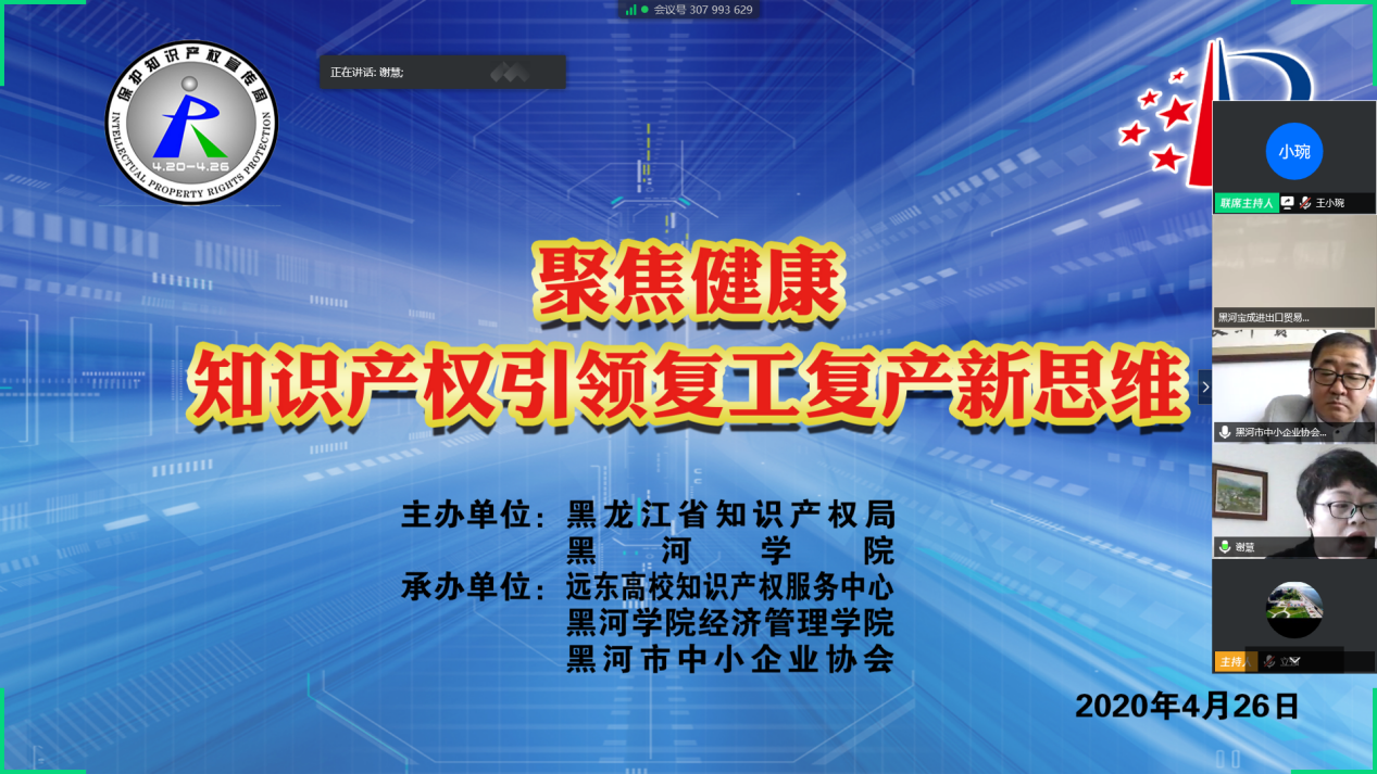 (撰稿人:王小琬)2020年4月26日,由黑龙江省知识产权局与黑河学院共同主办、远东高校知识产权服务中心、黑河学院经济管理学院和黑河市中小企业协会联合承办的“聚焦健康——知识产权引领复工复产新思维”线上会议如期举行。黑河学院副校长丛喜权教授及黑河市中小企业协会常务副会长兼秘书长李海共同出席了本次会议。