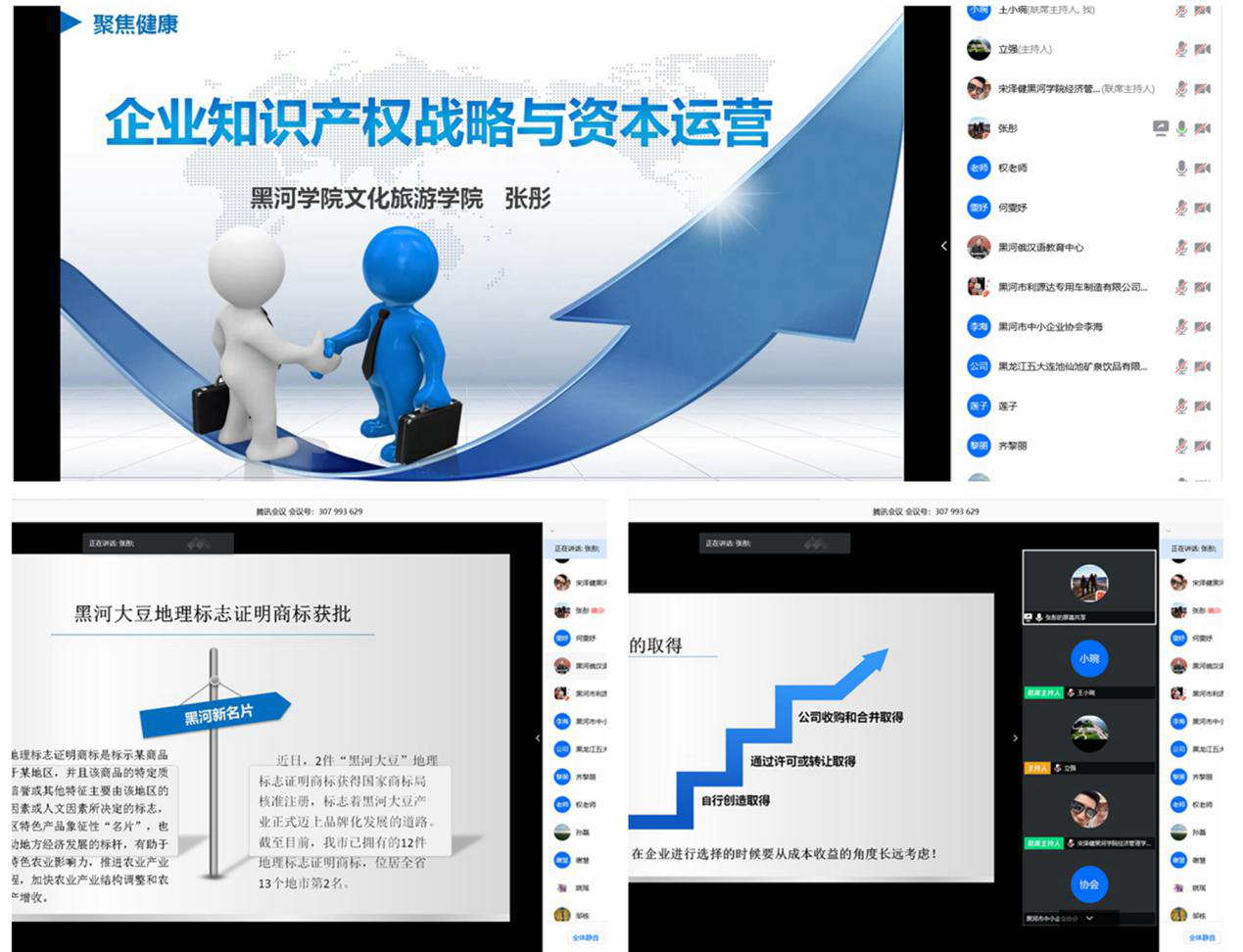 参加本次线上会议的人员还有:远东高校知识产权服务中心的专家学者及来自黑河学院科研处、经济管理学院及文化旅游学院的教师代表。本次会议还邀请到了黑河市品乐进出口贸易有限公司、黑河市利源达专用车制造有限公司、黑河聚英方舟知识产权服务有限公司、黑河市小微企业科技创业园、黑河市创客空间等近20余家企业共同参会。会议由经济管理学院副院长翟立强主持。
